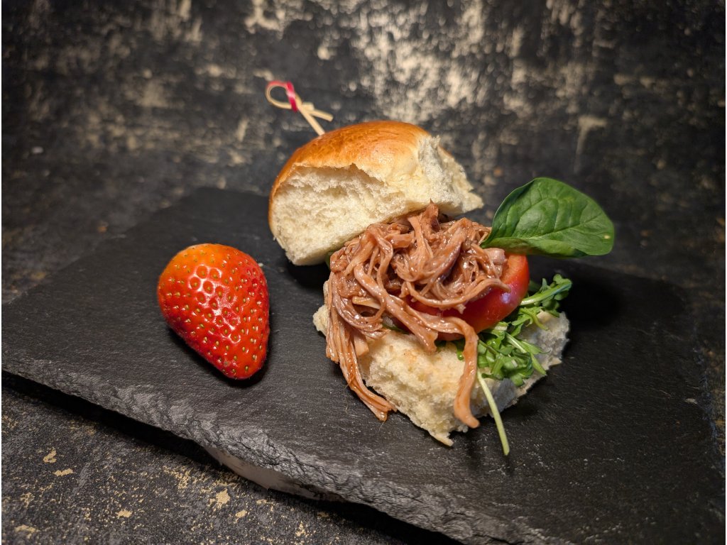 KYNUTÁ BUCHTA PLNĚNÁ TRHANÝM VEPŘOVÝM MASEM BBQ