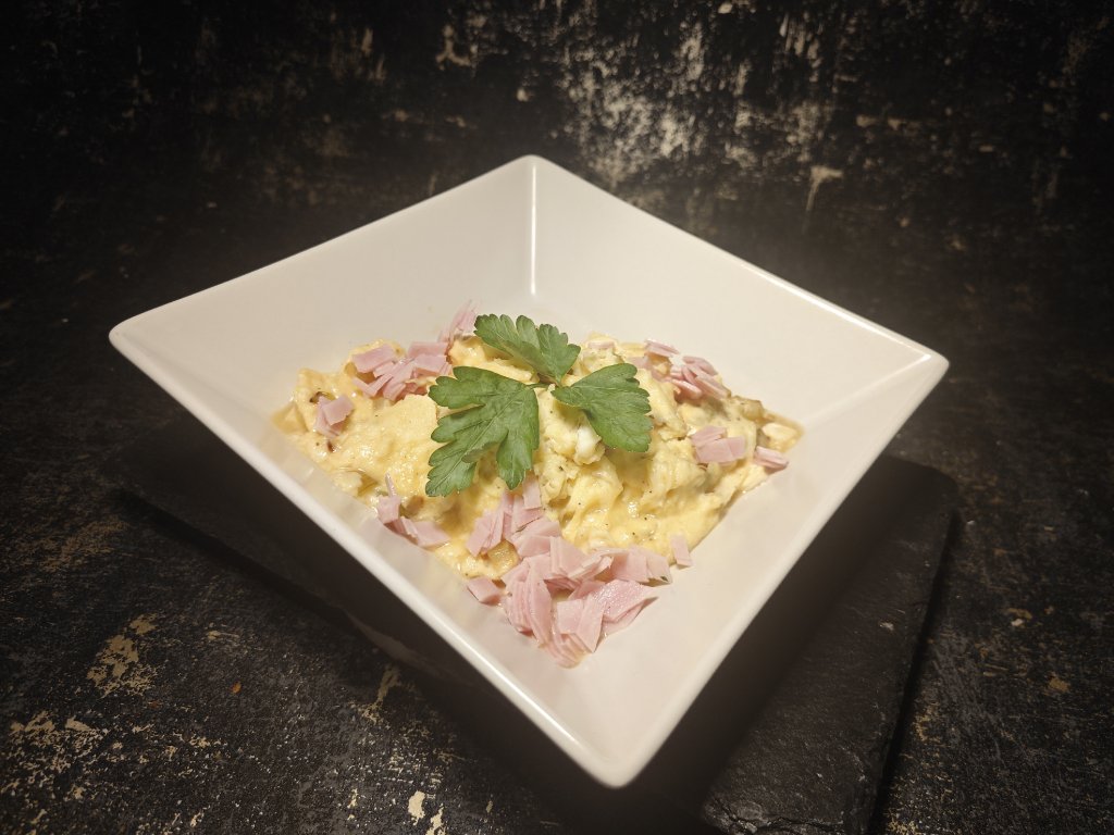 Míchaná vejce připravujeme na jemně osmažené cibulce, která dodává sladkost a aroma, šunka zase bohatost a sytost. Každé sousto je zážitek, který potěší i ty nejnáročnější gurmány.