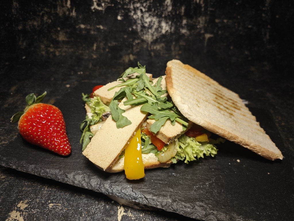 - Prémiové ingredience: Nepoužíváme náhražky ani kompromisy. Každý sendvič obsahuje pečlivě vybrané plátky uzeného tofu od ověřených českých výrobců a čerstvou grilovanou zeleninu – papriky, cukety, lilky a rajčata – vše připraveno těsně před zapékáním pro maximální chuť a šťavnatost.