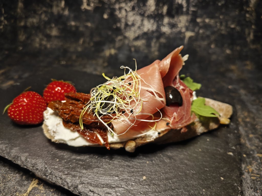 Pečlivě vybraný vícezrnný chlebík, ručně připravený podle farmářské receptury. K němu delikátní plátek italského prosciutta, který se rozplývá na jazyku. Sušené rajče pro intenzivní, sluncem zalitou chuť Středomoří. Lehce našlehané žervé – sametové, svěží, jemně nasládlé. A na závěr olivová tečka, která podtrhne celkový zážitek a vykouzlí úsměv na tváři.