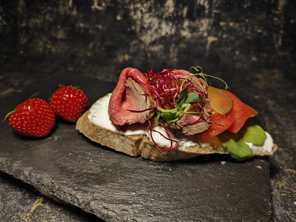 Náš chlebík je promyšlený do posledního detailu. Šťavnatý roastbíf je připravován s maximální péčí, aby byl dokonale měkký a plný chuti. Jemná dijonská majonéza dodává pikantní nádech, zatímco čerstvé rajče a kyselá okurka přidávají svěžest a příjemnou kyselost. A to vše na podkladu delikátního farmářského chlebíku – křupavého na povrchu, vláčného uvnitř.